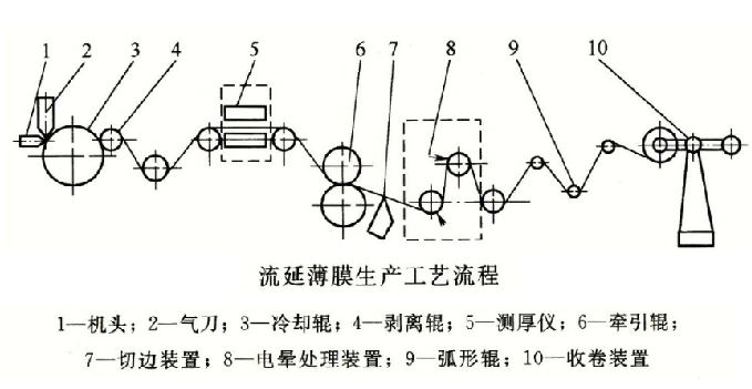 流延膜,是通過熔體流涎驟冷生產(chǎn)的一種無拉伸、非定向的平擠薄膜。