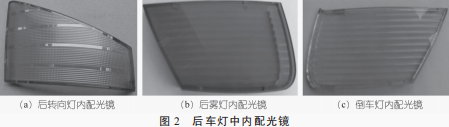 后燈外配光鏡和車內氛圍燈的光導材料。一般用于后燈配光鏡等。如圖 6 所示為一后燈配光鏡,也是車燈外觀件。配光鏡采用明白和明紅兩種 PMMA 料注塑成型。先注塑透明件,把透明件放到配光鏡模具中注塑紅色透明料,形成兩次注塑成型。也有在一副模具中實施兩次注塑成型的,即雙色注塑。PMMA 還用于后燈回復器燈面罩等。