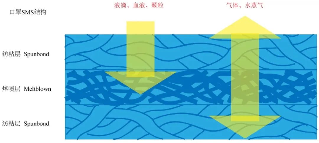 口罩的過濾層一般為三層無紡布,從內(nèi)到外分別為紡粘層、熔噴層、紡粘層,又稱SMS結(jié)構(gòu)。口罩內(nèi)層為紡粘非織造布,貼合皮膚使佩戴舒適,具有吸濕作用;中間層是熔噴聚丙烯非織造布,是核心部件,起主要的過濾防護(hù)作用;外層為紡粘非織造布,有阻水作用,可防止飛沫以及過濾較大顆粒。