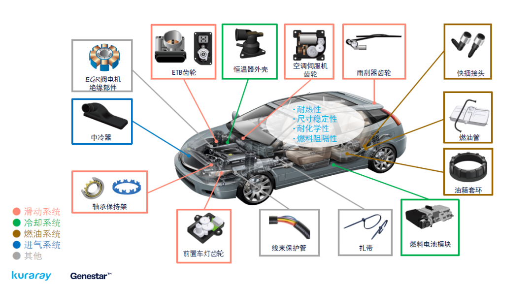 目前,發達國家平均每輛乘用車上的塑料用量約為140-160kg,其中約20%左右是各種尼龍材料,用于發動機周邊、底盤零部件以及結構件上。