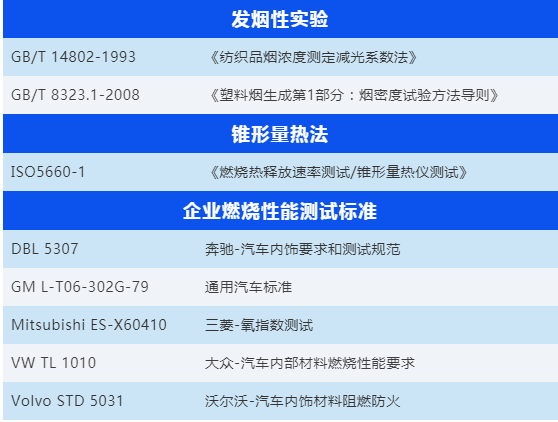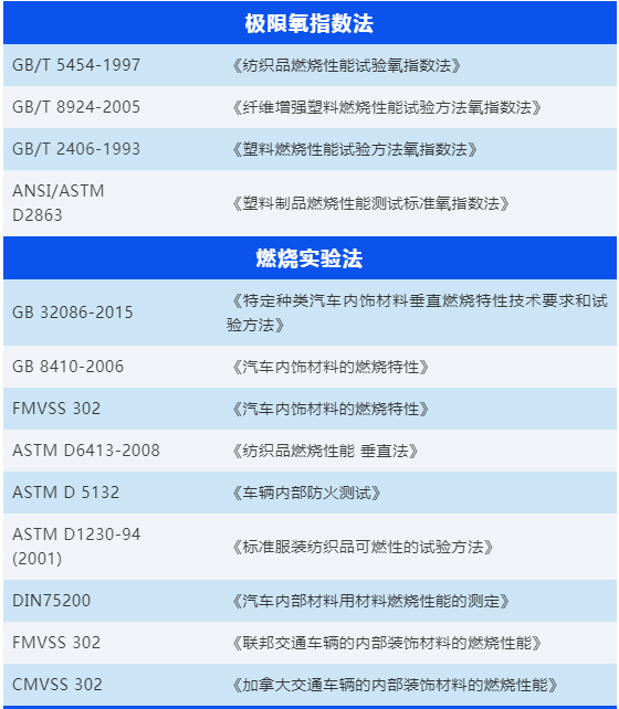 最后,附上相關內飾材料燃燒性能測試標準及方法: