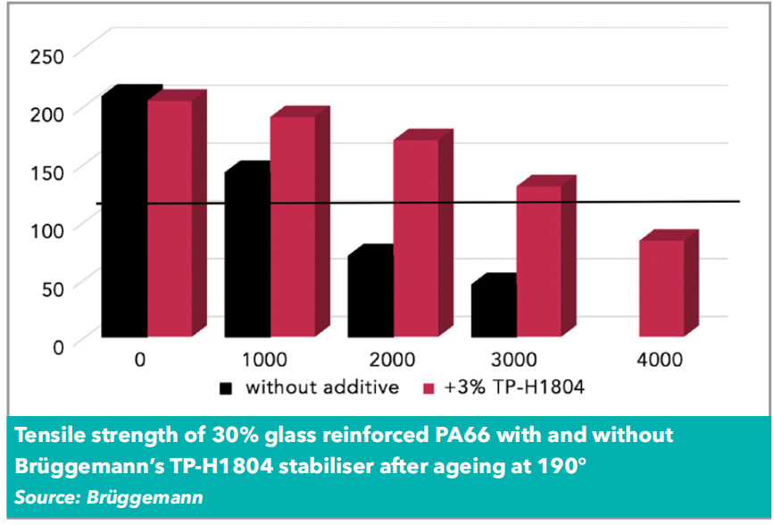 布呂格曼還推出了適用于 160-190 ℃ 溫度范圍的尼龍穩定劑 Bruggolen TP-H1804。它滿足在經典銅基穩定劑無法提供足夠保護的溫度下的應用需求。穩定劑可用于小型內燃機(ICE)的引擎蓋下應用。