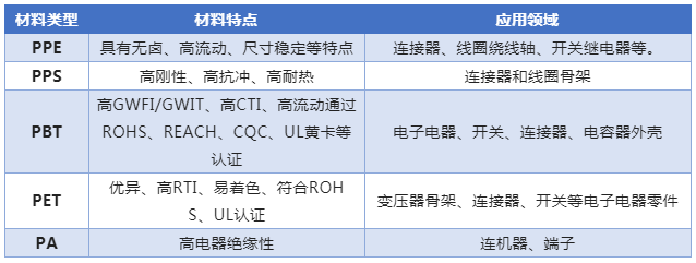 連接器接觸件是金屬,插拔次數高,最基本的要求就是材料具備良好的阻燃性,且耐熱,避免起火,目前連接器常用的材料有 PBT、PPS、PA、聚苯醚(PPE)、PET、液晶聚合物(LCP)等。
