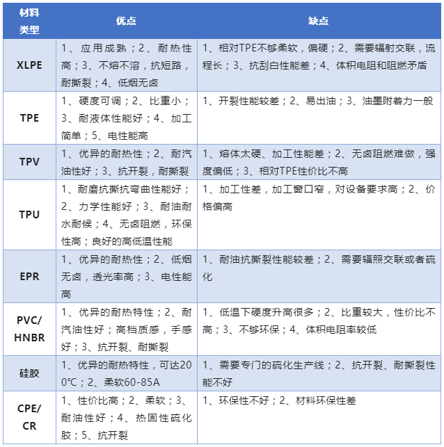 注:XLPE 為交聯聚乙烯、TPE 為熱塑性彈性體、TPV 為動態交聯熱塑性彈性體、TPU 為熱塑性聚氨酯彈性體、EPR 為乙丙橡膠,PVC/HNBR 為聚氯乙烯/氫化丁腈橡膠、CPE/CR 為氯化聚乙烯/氯丁橡膠。