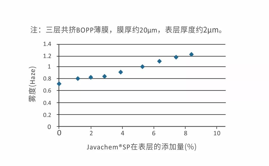 在三層共擠類 BOPP 薄膜中,酰胺類爽滑劑添加在芯層,添加量為 0.15-0.3 %,Javachem®SP 添加在熱封層,添加量為 2-4 %,由此可知,添加 Javachem®SP 在成本上會更有優(yōu)勢。