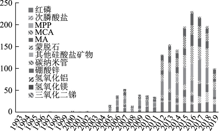 國內不同尼龍阻燃劑論文發表數量年度趨勢
