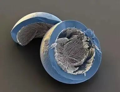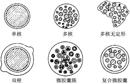 微膠囊的外形是多樣化的,可以是球狀的葡萄串形,也可以是不規則的形狀;膠囊外表可以是光滑的,也有折疊的;微膠囊的囊膜既可以是單層,也可以是雙層或多層結構;而囊膜所包覆的囊核心物質既可以是單核也可以呈多核,如下圖所示: