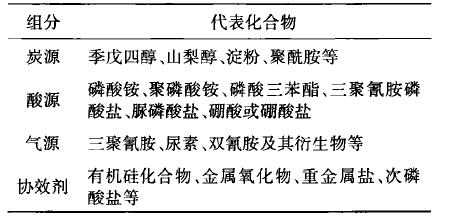 由于普通的膨脹型阻燃劑易吸潮,添加量大,同塑料的相容性差,所以還需要對其改性以提高其與塑料的相容性或讓其與具有協同作用的物質共用,以提高阻燃效果。無鹵膨脹型阻燃劑的典型組分如表 1 所示。