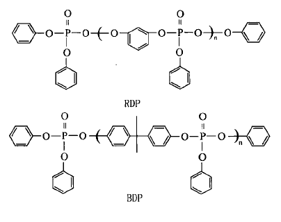 在有機磷阻燃劑分子設計中,把氮元素或硅元素引入其中而得到的磷-氮阻燃劑或磷-硅阻燃劑往往可以發揮兩者的協同阻燃作用。雙酚A雙(二苯基磷酸酯)(BDP)和間苯二酚雙(二苯基磷酸酯)(RDP)是近年來開發出的新型無鹵環保有機磷類阻燃劑,其結構式如圖 1 所示。