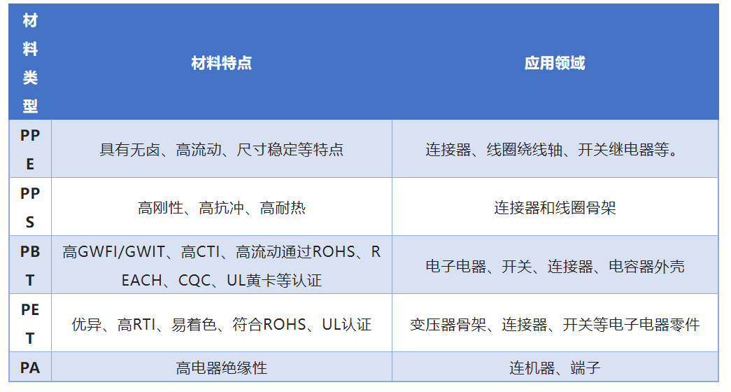 連接器接觸件是金屬,插拔次數高,最基本的要求就是材料具備良好的阻燃性,且耐熱,避免起火,目前連接器常用的材料有 PBT、PPS、PA、PPE、PET、LCP 等。