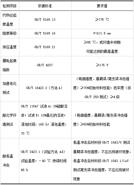 中國質(zhì)量認(rèn)證中心(CQC)于 2016 年 4 月 24 日發(fā)布了國內(nèi)首個《電動汽車充電設(shè)備非金屬材料外殼技術(shù)規(guī)范》(見表 2),該技術(shù)規(guī)范從充電樁的實際使用環(huán)境出發(fā),通過對材料耐老化、耐候、耐低溫沖擊、阻燃、耐熱、電氣絕緣等方面性能的考核,來評價材料是否能夠達(dá)到長期使用要求。