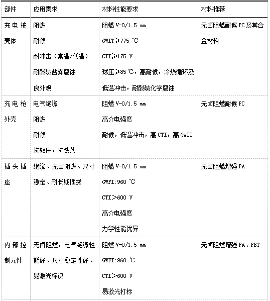 綜合針對充電設(shè)施的相關(guān)技術(shù)標(biāo)準(zhǔn),參照其他類似應(yīng)用領(lǐng)域的需求,轉(zhuǎn)化成對材料的具體性能要求(見表 3),結(jié)合不同材料對應(yīng)的性能,可以對充電樁的不同部件提供對應(yīng)的改性塑料材料解決方案。