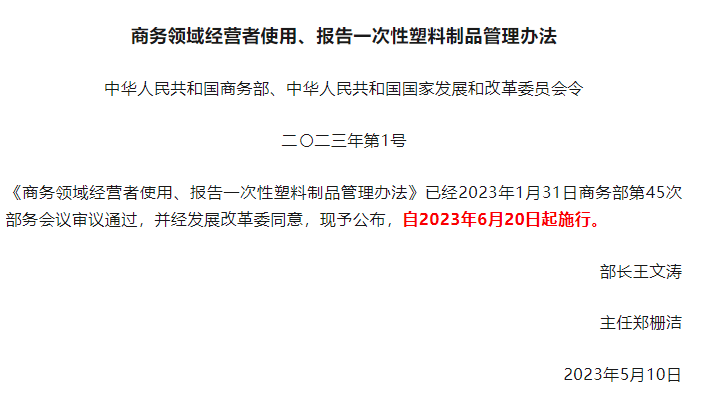 5 月 16 日,商務部、發展改革委發布《商務領域經營者使用、報告一次性塑料制品管理辦法》。《管理辦法》重點對商務領域經營者使用、報告一次性塑料制品提出規范要求。