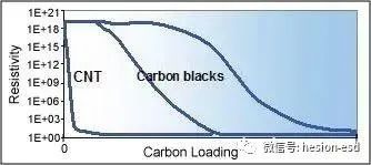 CNT 正在快速增長,可用于批量生產或特定的設備。盡管成本連續下降,但是相對眾所周知的 CNT 仍然很昂貴。碳納米管(CNT)的極低電阻率允許獲得 CN T含量低于 1% 的 EMI 聚合物,遠低于常規和導電炭黑的使用水平。