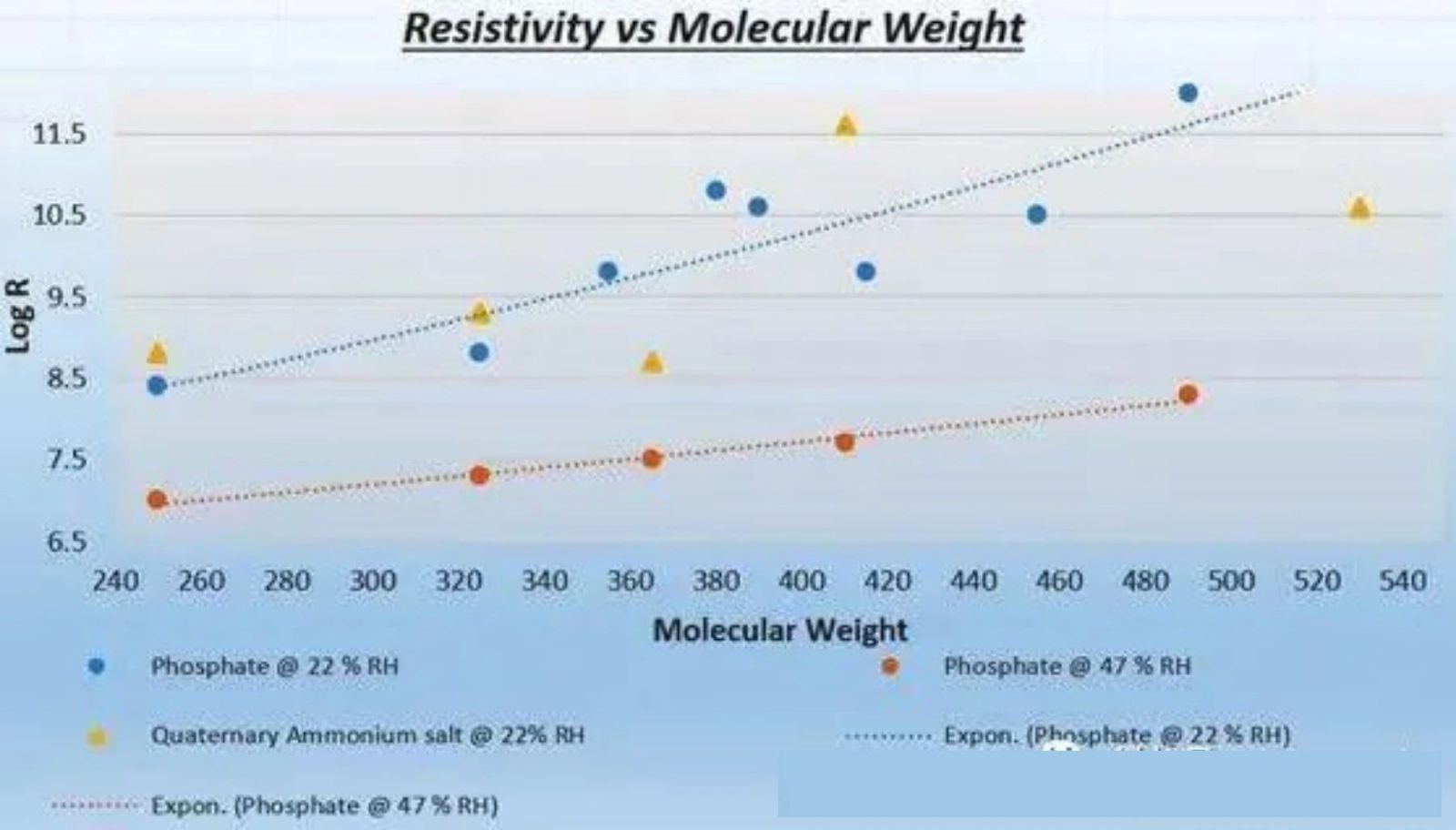 磷的有效性隨 RH% 的降低而顯著降低。在聚合物加工過程中,將 RH 從通常的 60-70% RH 范圍降低到小于 45% 會導致靜電控制能力下降 10 倍。季胺通常不受濕度變化的嚴重影響,盡管有效性隨分子量增加呈非線性關系。下圖說明了 RH 對靜電耗散(通過電阻率的對數測量)對物種分子量的影響。