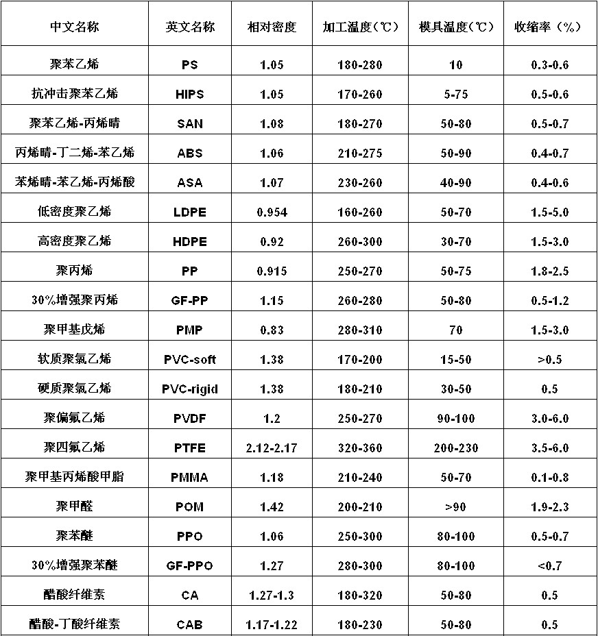 塑料原料的品種不同,收縮率不同,具體見表 1。