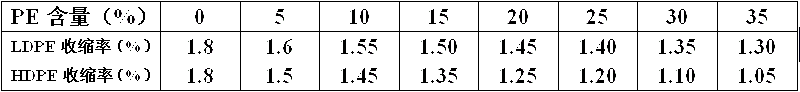 以在 PP 中加入 PE 樹脂為例,不同含量 PE 對 PP 收縮率的影響見表 8。