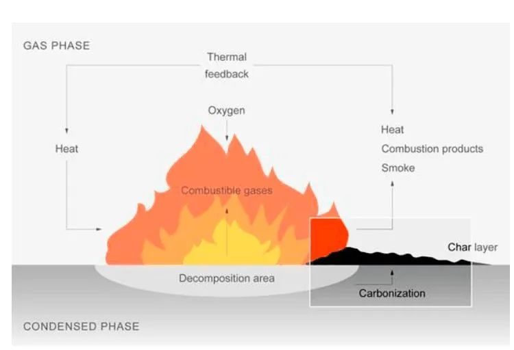 在燃燒時,磷化合物分解生成磷酸的非燃性液態膜,其沸點可達 300 ℃。同時,磷酸又進一步脫水生成偏磷酸,偏磷酸進一步聚合生成聚偏磷酸。在這個過程中,不僅由磷酸生成的覆蓋層起到覆蓋效應,而且由于生成的聚偏磷酸是強酸,是很強的脫水劑,使聚合物脫水而炭化,改變了聚合物燃燒過程的模式并在其表面形成碳膜以隔絕空氣,從而發揮更強的阻燃效果。