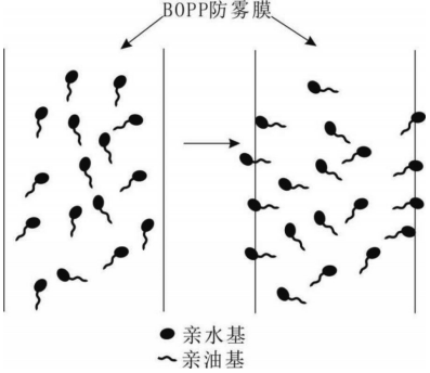 通過在薄膜配方體系中添加雙親組分防霧劑,其有效成分逐漸遷移至薄膜表層,親水基團朝外,親油基團朝內。當水蒸氣接觸到薄膜表面時便被親水基團掠住,使得水蒸氣在薄膜表面均勻鋪展,形成一層極薄的“水膜”,從而達到防霧滴的效果,見圖 2。