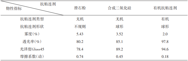 有機抗粘連劑主要為有機硅聚合物或甲基丙烯酸聚合物。有機抗粘連劑光學性能好,對薄膜的透明度幾乎沒有影響,同時兼具增滑的功能,使薄膜具有較低的摩擦系數。