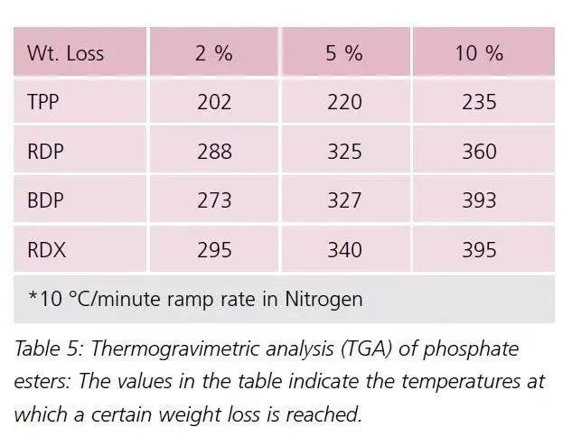 BDP 在熱穩(wěn)定性及水解穩(wěn)定性方面比 RDP 略為優(yōu)越。但由于其粘度大大增加,以至于 BDP 加料比 RDP 更為困難。加之 BDP 磷含量較低,因此 BDP 的阻燃性不如 RDP。