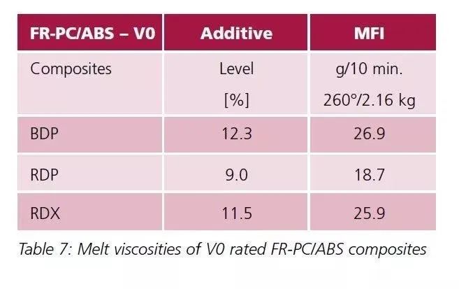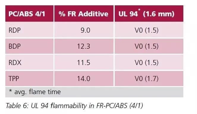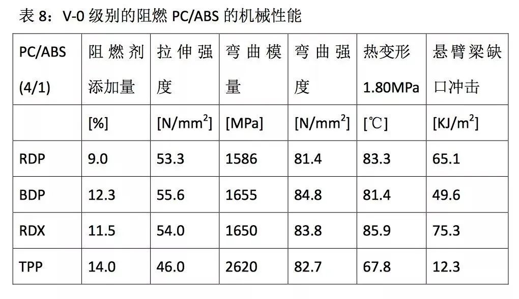 一般來(lái)說(shuō),使用 BDP 的 PC/ABS 合金的 HDT 比使用 RDP 略高些。在 ABS 含量為 ≤ 25 % 的 PC/ ABS 合金中通常需要添加 12 % 的 BDP,同時(shí)加入 PTFE 以確保通過 V-0 級(jí)。