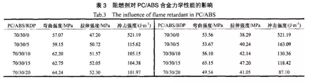 從表 3 可知,隨著阻燃劑的增加,PC/ABS 合金的彎曲強(qiáng)度和拉伸強(qiáng)度都有所增加,但增幅不大。當(dāng) RDP 添加量為 15 % 時(shí),PC/ABS 合金的彎曲強(qiáng)度和拉伸強(qiáng)度分別增加了 5.68 MPa 和 4.85 MPa,當(dāng) BDP 含量為 15 % 達(dá)到最大值,PC/ABS 合金的彎曲強(qiáng)度和拉伸強(qiáng)度分別增加了 11.59 MPa 和 8.91 MPa。