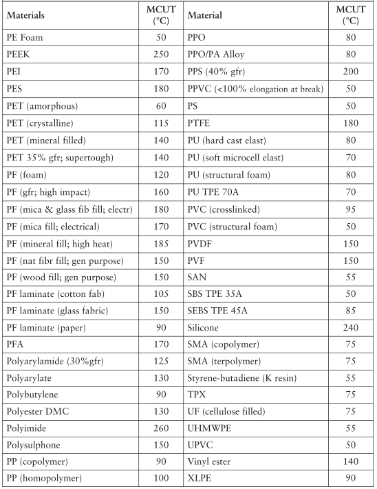 對(duì)于任何給定的聚合物類型,UL 指數(shù)或 MCUT 將涵蓋一系列值,具體取決于抗降解保護(hù)的質(zhì)量。下表列出了塑料和橡膠的“通用最小值”值,這些值可用于具有最低保護(hù)(即通常需要在加工條件下穩(wěn)定材料)的商業(yè)等級(jí)。盡管通常未指定添加劑的類型和濃度掩蓋了聚合物化學(xué)的詳細(xì)影響,但大致的優(yōu)劣順序仍然很明顯。