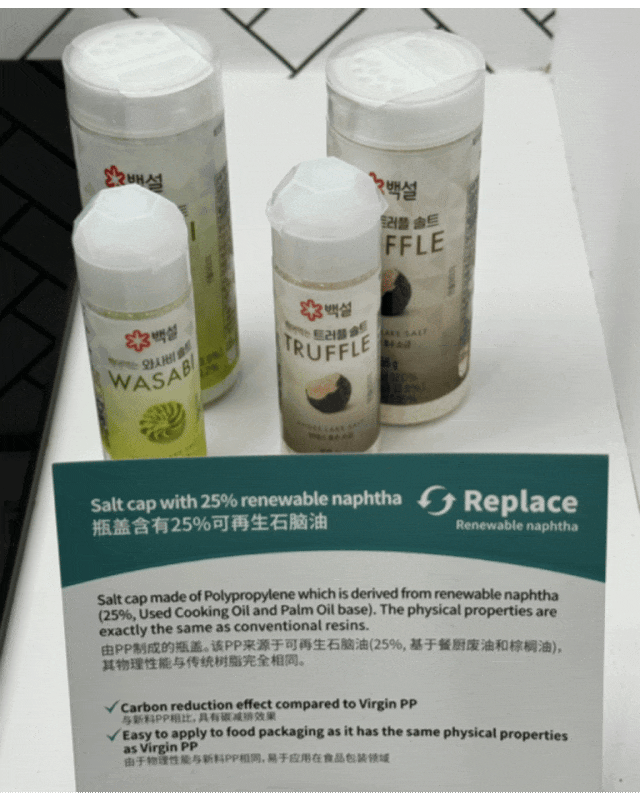 SK geo centric 的可再生 PP,可再生含量為 25 %,其來源主要是可再生石腦油,比如餐廚廢油盒棕櫚油。與新料 PP 相比,物理性相同,可以實現碳減排,應用在食品包裝領域。