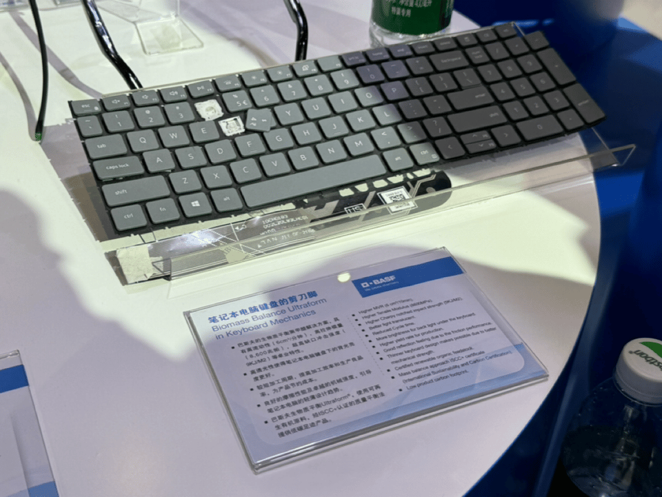 巴斯夫展示了使用可再生有機原料的筆記本電腦鍵盤的剪刀腳和使用了經認證的可再生有機原料生產的座椅部件。