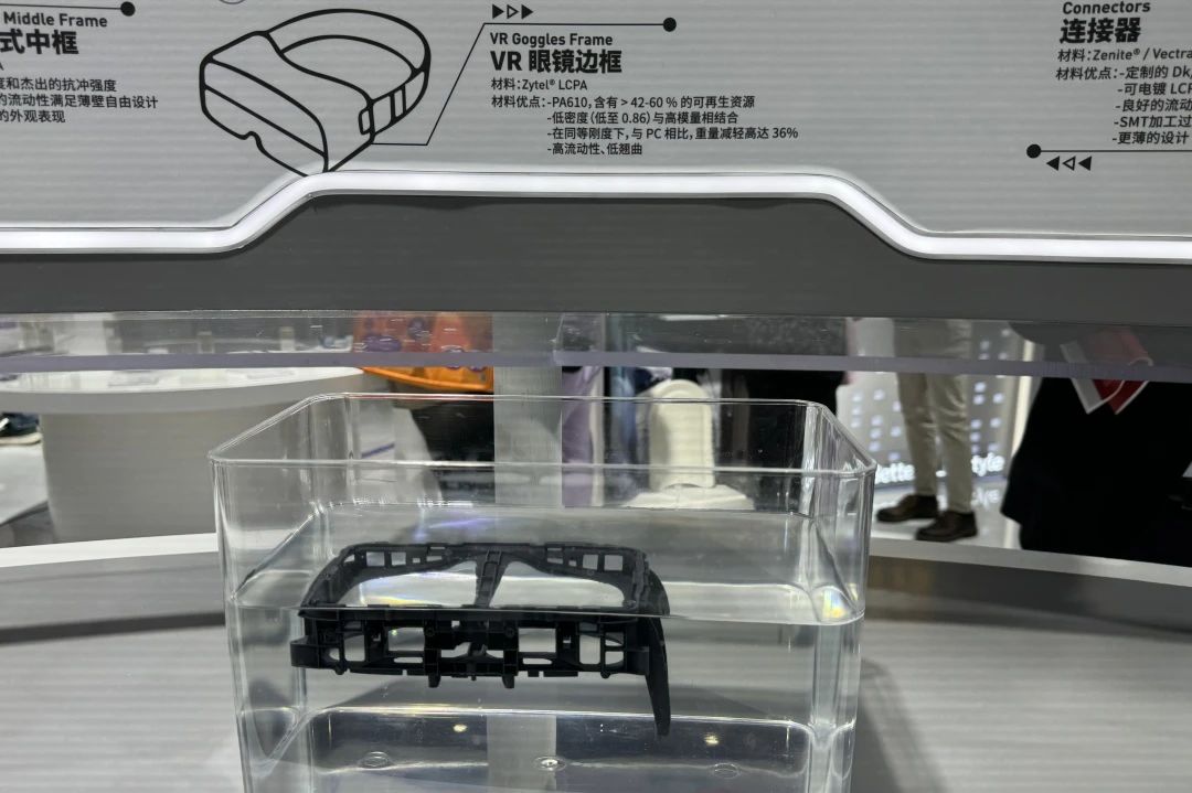 塞拉尼斯含有 42 – 60 % 可再生材料 Zyte®LCPA 可用于 VR 眼鏡邊框,其可再生來源于蓖麻油,具有高流動性、低翹曲度、低密度等特點。同剛度下,與 PC 相比重量減輕高達 36 %。