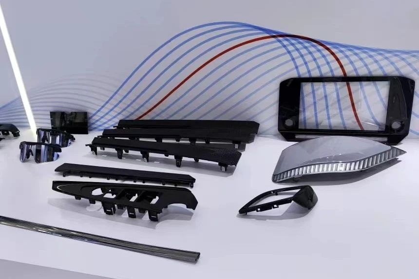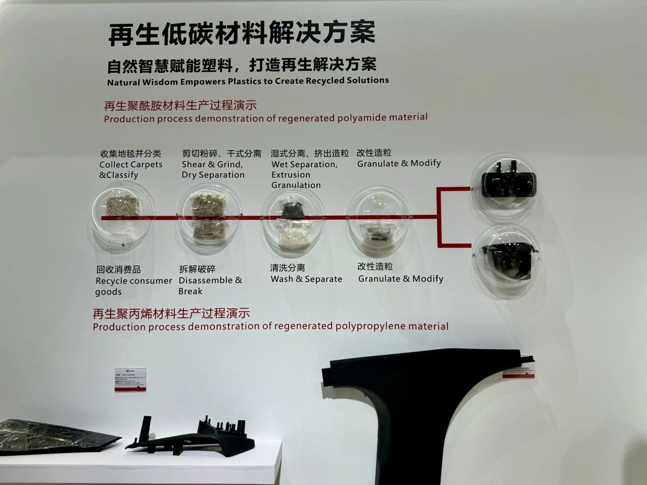 普利特帶來了再生低碳解決方案,展示了再生聚酰胺和再生聚丙烯的生產過程和部分產品,即采用再生 ABS、再生 PC/ABS 的門扶手,還有再生料立柱。