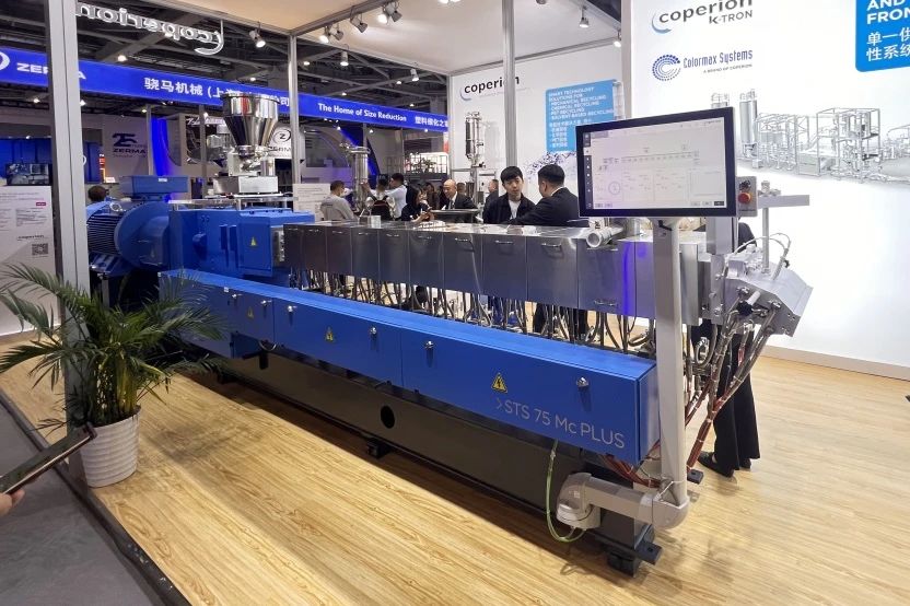 科倍隆攜手 Herbold Meckesheim 為本次展會帶來了他們高質量的塑料回收工藝和整體解決方案。在消費品包裝廢棄物的回收再生方面,經過處理的單類廢塑料跟添加劑、填料等,通過 Herbold 的破碎和清理設備、科倍隆的喂料系統、雙螺桿擠出機以及輸送系統進行一系列的破碎、清理、熔融、過濾、造粒及除味等步驟得到高品質再生塑料粒子。值得一提的是,科倍隆針對低堆積密度的物料開發了 ZS-B MEGAfeed 側喂料機,這款側喂料機可喂入堆積密度低至 200 kg/m3 的塑料碎片或薄膜。針對回收塑料的異味等問題,科倍隆還提供了相應的除味解決方案。