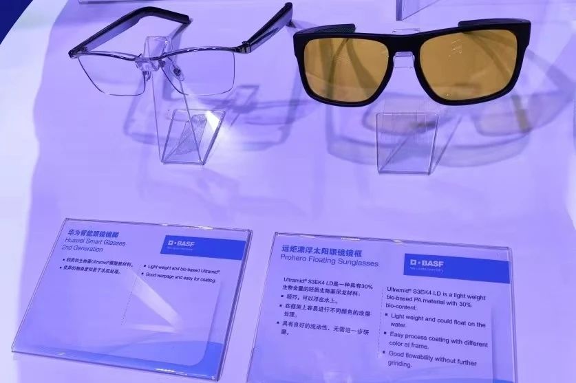 巴斯夫展示了應用于個人消費品的兩款生物基聚酰胺材料 Ultramid®。其中與遠炬協力開發的漂浮太陽鏡框架生物基含量達到30 %,與華為打造的智能眼鏡鏡腳生物基含量達到39 %。