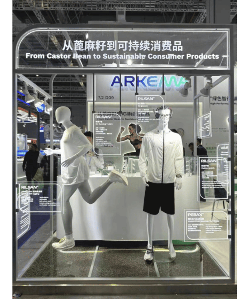 阿科瑪在本次展示了來源于蓖麻籽的材料在衣物、手表、跑山鞋中的應用。