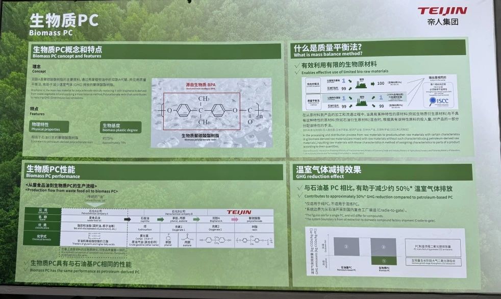 帝人集團本次帶來了生物基 PC,其生物基含量約為 75 %,與石油基 PC 相比可減少約 50 % 的溫室氣體排放。