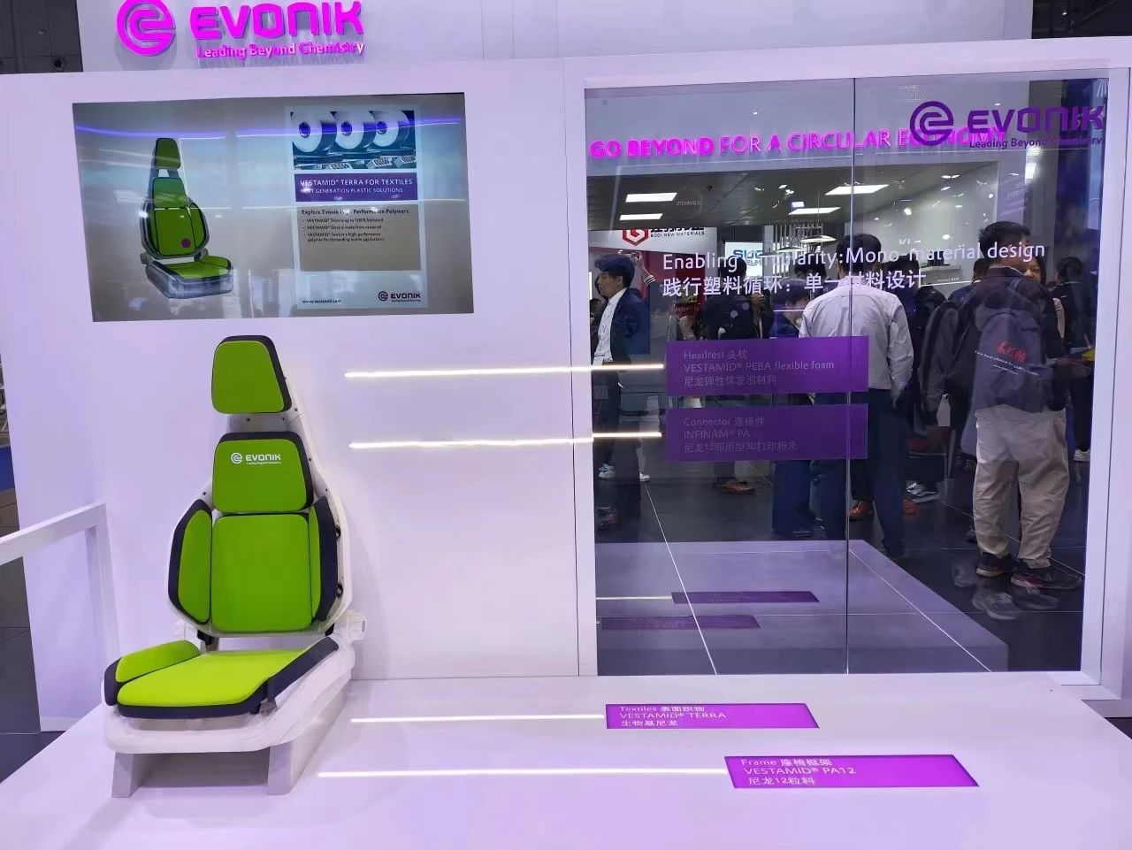 贏創化學展示了已用于座椅框架和表面織物的生物基 PA。