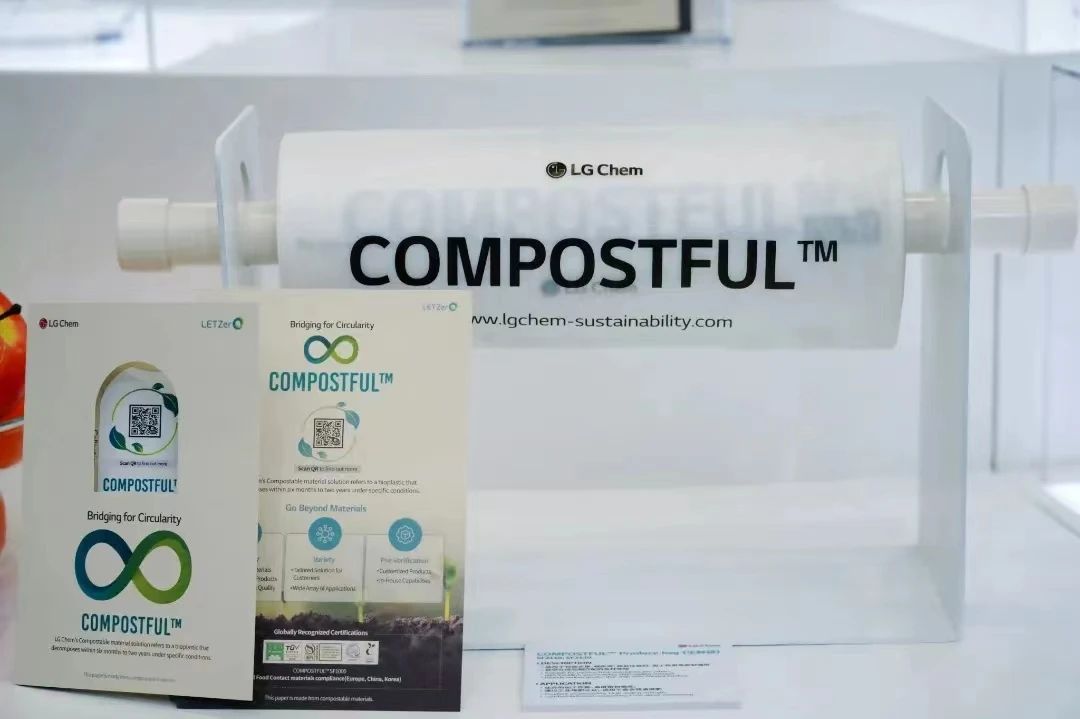 LG化學本次帶來首次亮相橡塑展的 COMPOSTFULTM,是生物降解材料,獲得了美國、歐洲頒發的生物降解認證。這款材料在土壤中 6 個月內自然降解,以水、二氧化碳和廢料的形式回歸自然,可以應用在購物袋、農用地膜等包裝材料中。