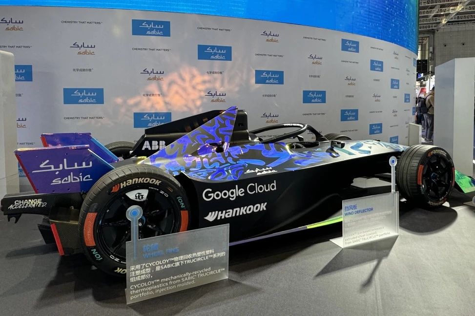 SABIC 展臺這輛酷炫的賽車吸引了無數眼球,其輪鰭采用了 CYCOLOYTM 物理回收熱塑性塑料注塑成型。