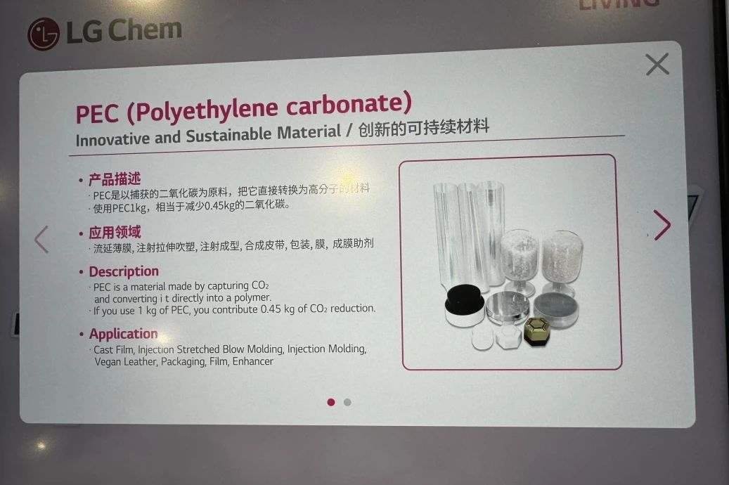 LG 化學本次展示的 PEC 是以捕獲的二氧化碳為原料,把它直接轉變為高分子材料。使用 1kg 的 PEC,相當于減少 0.45 Kg 的二氧化碳。