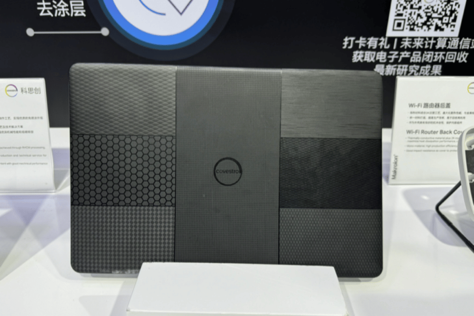 科思創在展臺展示了兩款筆記本電腦外殼,一種是碳纖增強纖維采用了 PCR + RE 材料方案,高含量混合環保材料方案。