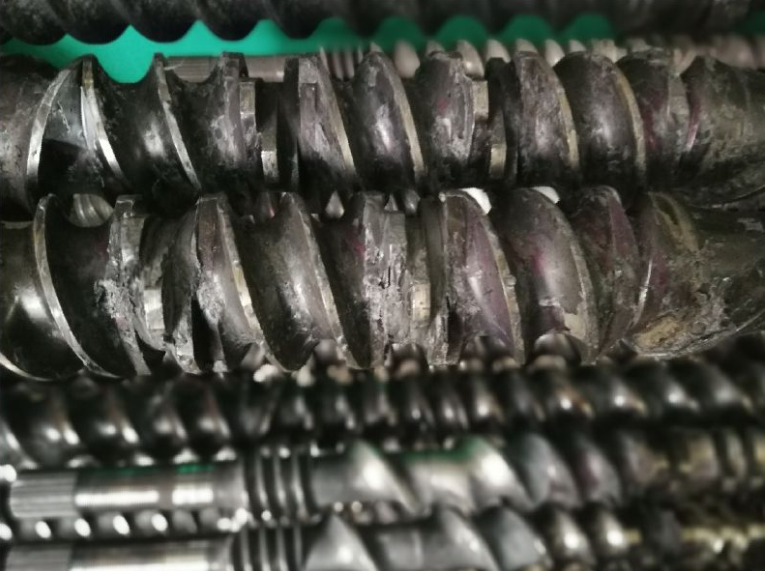 3、轉動雙螺桿擠出機螺桿并取出孔板,排出炮筒內殘余洗機料,清理孔板;