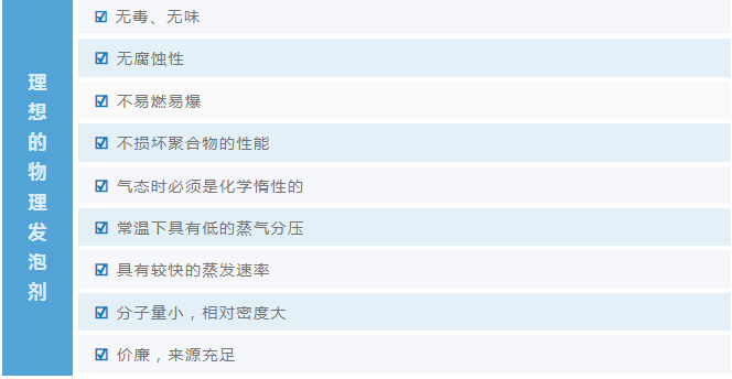 物理發(fā)泡劑在使用過程中不發(fā)生化學變化,所以只能依靠其物理狀態(tài)的變化來達到發(fā)泡的目的。