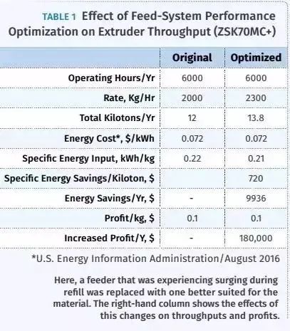 其中采用的是一個雙螺桿擠出機(jī)加工一種聚烯烴母粒,利潤幅度在 10 ¢/kg。在這個例子中,一個在補料中存在波動的喂料機(jī)被替代以一種最適應(yīng)材料的喂料機(jī),允許產(chǎn)量從 2000 kg/hr 增加到 2300 kg/hr (4409 to 5070 lb/hr)。這產(chǎn)生了一個可能 $ 180,000 的額外年度利潤,超過新喂料機(jī)成本的四倍。此外,由于擠出機(jī)充滿度增加,材料的比機(jī)械能投入減少。這導(dǎo)致節(jié)能 5 % 或 138 MWh/年。