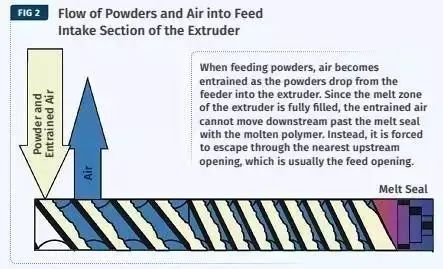在典型的聚合物加工中,有一個熔融區(qū),包含一段充滿聚合物的捏合塊。由于這段擠出機(jī)被完全充滿,困住的空氣移動到下游通過具有熔融聚合物的熔體密封層。相反,它被迫通過最近的上游開口逸出(圖 2)。結(jié)果,在進(jìn)入的原材料與存在的困氣之間存在一個競爭性的流動。