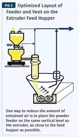 減少困氣量的一個方法是,將粉末喂料器置于與擠出機(jī)同樣的豎直水平,盡可能地接近喂料料斗。這樣將縮小落差,減少空氣受困數(shù)量。