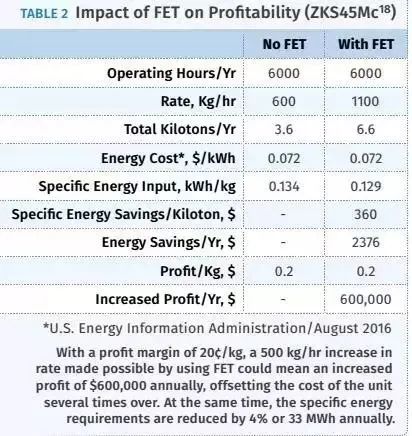 要計算安裝 FET,可以考慮一個 45 mm 雙螺桿擠出機(jī)共混填充 40 % 滑石粉聚丙烯用于汽車的例子(表 2)。