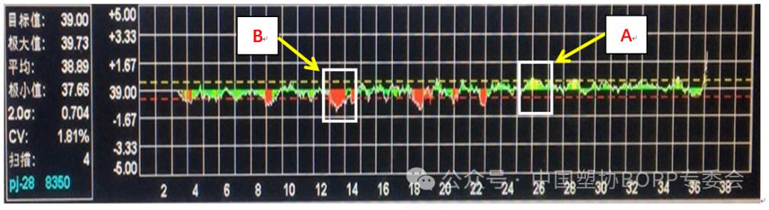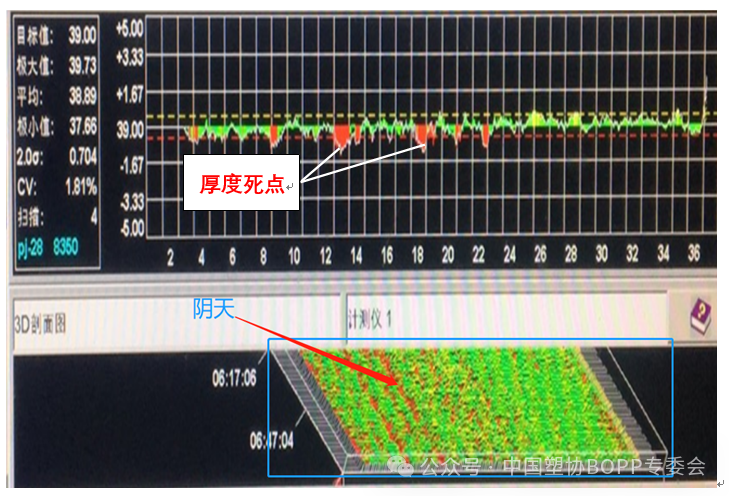 “陰天”的厚度形態是一種最糟糕的厚度狀態,薄膜的橫向厚度起伏較大,厚度“死點”的地方比較固定,厚度偏差值隨時間的變化不大,相鄰兩點的厚度差基本上在 0.5um 以上,標準偏差 2δ 值大于 1.3%,敲擊時,厚度高點很硬,低點很軟,且持續的時間很長,一旦出現就是批量降級。這種情況往往需要人工干預后才能恢復正常,但這種情況產生的原因復雜,解決起來較為麻煩。這種情況的產生的厚度缺陷,往往位置比較固定,短期內不會消失,且會日益加劇,因此。把這種因素可概括為非流動性因素。