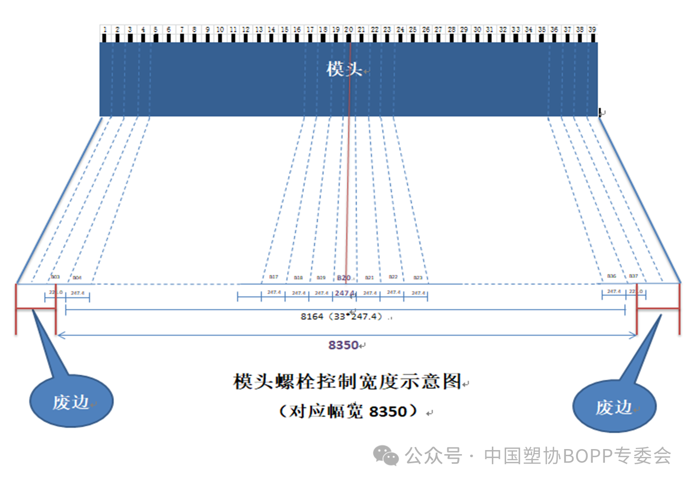 2、根據生產線橫拉出口的薄膜寬度計算出每個螺栓所控制的薄膜寬度(三菱 8.2 線 39 個模頭調節螺栓,制膜寬度為 8350mm 時,為每個螺栓的厚度控制寬度約為 247.4mm),按照此寬度間隔,標出其余厚度調節螺栓的位置。