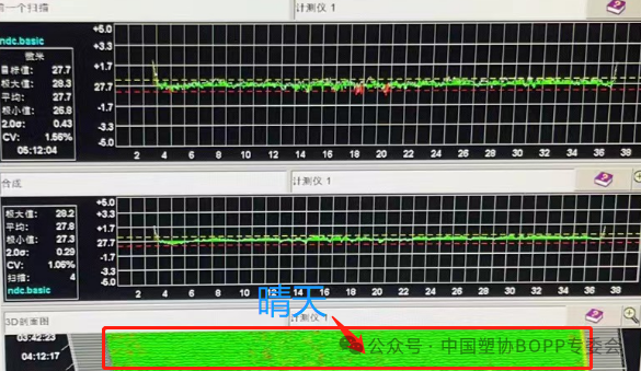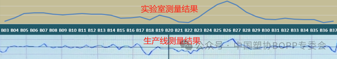所謂測得準,是指實驗室在進行厚度檢測時,結果準確,包括兩方面的涵義,一是實驗室用于檢測薄膜厚度的測厚儀,在對標準樣進行測量時,測量值準確,特別是測量值的穩定性、重復性好。二是位置準確,此時可采用點對點測量法(筆者在之前的文章《雙向拉伸薄膜的點對點測量法》中已有詳細的介紹,可從塑膜網微信公眾號中查看),其含義是指實驗室在進行薄膜厚度檢測時,寬度方向上所選的測量點能與厚度控制螺栓控制范圍的較為準確地一一對應,如此,就可以根據在線測厚儀顯示圖像來找出所檢測的產品上真正的厚度偏差最大和最小值,反過來也能較好地指導厚度的調整,采用這樣測量的結果來評價薄膜的厚度質量則更為可靠。如圖 5 就是薄膜在線生產時生產線監控測厚儀的厚度掃描結果與實驗室厚度測試結果的對照,厚度形態基本一致。